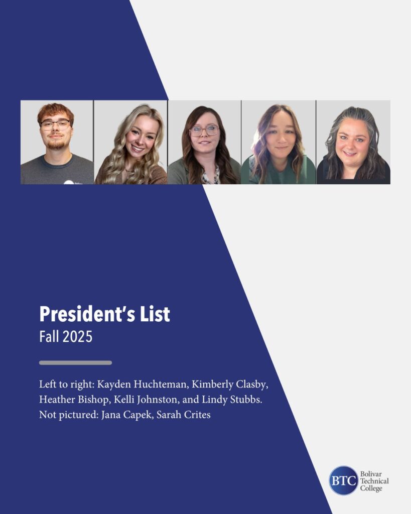 January 28, 2026We’re proud to recognize our Fall 2025 President’s List honorees at Bolivar Technical College. These nursing students demonstrated exceptional academic performance while balancing rigorous coursework, clinical experiences, and personal responsibilities.